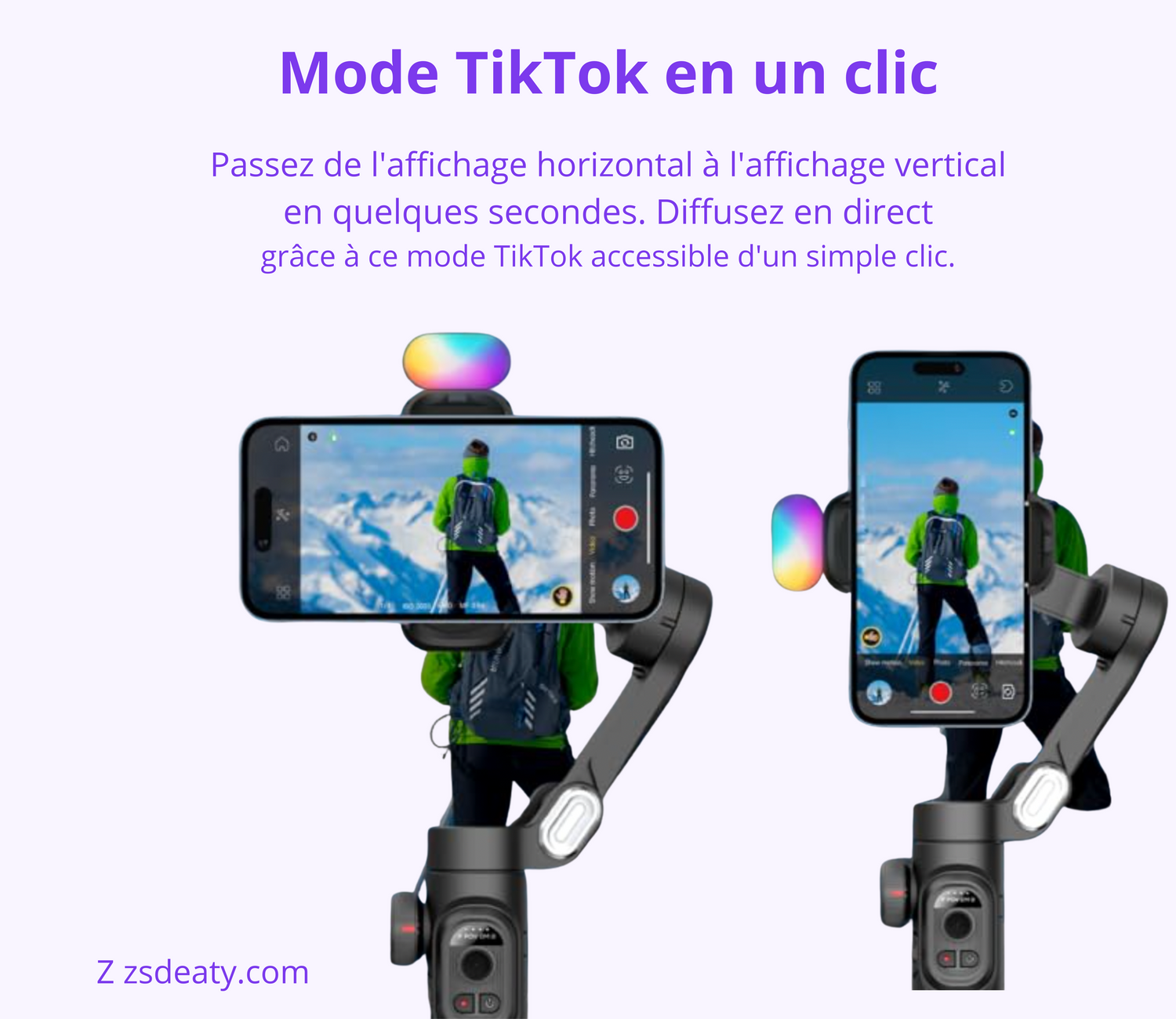 Passez de l’horizontal au vertical en quelques secondes grâce au mode TikTok en un clic. Le stabilisateur adapte instantanément l’orientation de votre smartphone pour créer du contenu optimisé pour les réseaux sociaux. Diffusez en live ou réalisez vos vidéos verticales sans effort, prêtes à être partagées avec votre communauté.